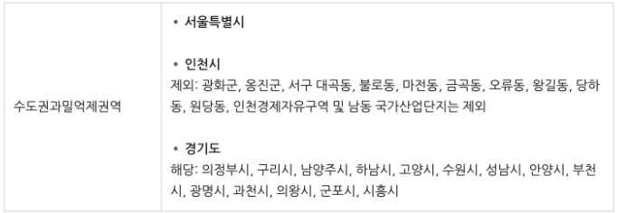 그럼, 수도권 과밀 억제 권역으로 지정된 곳은 "서울특별시", "인천시(광화군, 옹진군, 서고 대곡동, 불로동, 마전동, 금곡동, 오류동, 왕길동, 당하동, 원당동 , 인천경제자유구역(송도 등)과 남동 국가산업단지는 제외)", 및 "의정부시", "구리시", "남양주시", "하남시", "고양시", "수원시", "성남시", "안양시", "부천시", "광명시", "과천시", "의왕시", "군포시", "시흥시"가 수도권 과밀 억제 권역으로 해당됩니다.