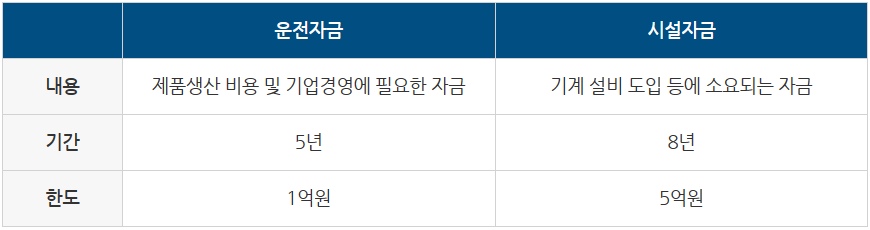 우선 운전 자금 또는 시설 자금의 용도로 지원이 가능하며, 운전 자금의 경우 5년 기간 동안 최대 1억원 한도로의 융자 혜택을 보실 수 있으며, 시설자금의 경우는 8년 기간 동안 최대 5억의 융자 혜택을 보실 수 있습니다.