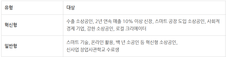 혁신형의 경우 수출 소상공인, 2년 연속 매출 10% 이상 성장한 업장, 스마트 공장 도입 소상공인, 사회적 경제기업, 강한 소상공인, 로컬 크리에이터 등으로 구성이 되며, 일반형은 스마트 기술, 온라인 활용, 백 년 소공인 등 혁신형 소상공인, 신사업 창업사관학교 수료생으로 구성됩니다.